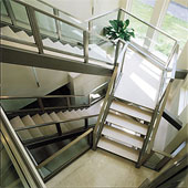 Study in Glass and Chrome. Surrounded by chrome and glass rails, these stainless steel "backless" stairs float within the stairwell they effortlessly inhabit. The stairs do not actually touch any supporting walls. Instead, steel beams were run into walls and the stairs, which have a maple tread insert painted to look like steel, were attached to them. "Nothing was normal about these stairs," or the angular landings between them, recalls Rick Rafael, owner of Rafael Builders. Because of their complexity, Rafael "field-built" the stairs on-site, cutting steel, shaping, and making constant adjustments. Finally cohering, the breathtaking design echoes the home's contemporary lines, becoming a place "flowing in space."