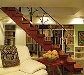 A confluence of creativity between contractor Ed Gavin and artist Chris Gavin (no relationship) produced a stair that, though gorgeous, was not quite what interior designer Rhea Arnot first imagined. To enliven her remodeled basement, Arnot envisioned a "floating" stair, without handrails or stair backs. However, when Ed Gavin brought in 4-inch thick planking, she changed her mind. Responding conceptually to Gavin's workmanship, artist Chris Gavin crafted a handrail made from marine steel. The design infuses lightness and movement into the stair, slowing down its descent. The motifs on the railing are designed to rhythmically "float" down the stairs, banishing forever the residual darkness once harbored by the cramped basement. With a light-filled room and "piece of sculpture" in the middle of her floor, Arnot has since set up studio space.