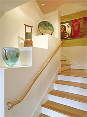 Bob Hammond, principal of Hammond Wilson Architects, designs stairs as "sculptural elements in their own right." In the case of the Hebert House, home to a potter whose art is integral to her life, Hammond was forced to reverse his "typical inclination." Because the goal was to foreground the artwork, the stair's design is subdued - the railing is spare, there are no open balusters, nothing to compete with the white stepped platforms. Exhibition spaces for pottery and sculptural forms, these artfully follow the stair. The landing, exceptionally wide, affords serious viewing. One can commune with the giant double portrait diptych on the stairwell or take in the dramatic "sculpture wall" in an adjacent living room. From the stairs, one is treated to "art in the round," viewing prints, paintings, pottery, and more from unusual heights and perspectives.