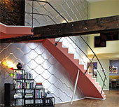 The Modernist. Architect John Mariani could do anything he wanted with the 1920s telephone exchange building he purchased, gutted, and renovated. The design evolved into a cylinder he inserted in the middle of the space, shingled in metal, and wrapped a stair around. The interior, unusually wide, presented him with the opportunity to make the stair a sculptural focal point. Painted strictly in red-orange, light-green, yellow, and blue, the original Bauhaus color scheme, the home's modernist palette is carried through in the bold stairs that divide the dining and living spaces. Trimmed in white, they appear to dive down from the building's airy upper reaches, transcending function to become a figural form.