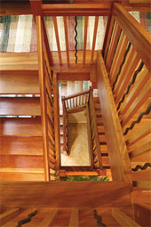 Bruce Finkelstein of HBF plus Architects likes to think of stairs as a piece of two-story furniture that not only reaches from one floor to the next but also reflects physical connections between inhabitants. With growing families, the basement is often accessed by diminutive stairs and usually deemphasized. Not so with this residence, surrounded by woods, where two creative professionals live and work. Every flight of stairs is elegantly finished in maple, cherry, and mahogany. The wavy steel balustrade introduces some curvilinear "fun" to the stair, relieving "the dead seriousness" of the home's primarily angular construction. The wide landings and "switchback" design enforce the interconnectivity of the owners, who work at home, often in isolation. Speared and separated, the balusters are see-through: you can look from the artist's studio on the top floor all the way down to the master bedroom on the bottom, sensing the house and all activity along the way.
