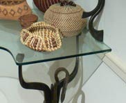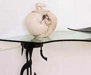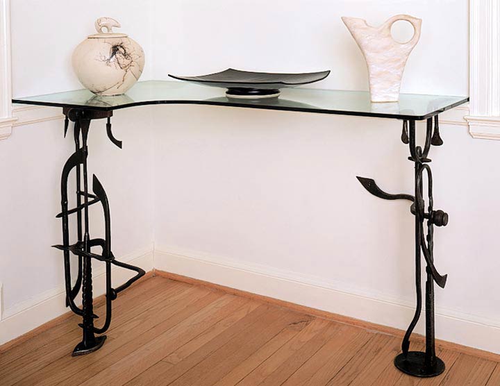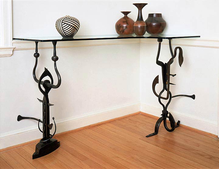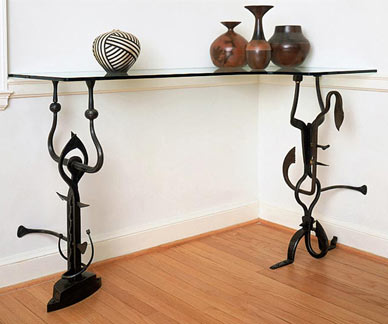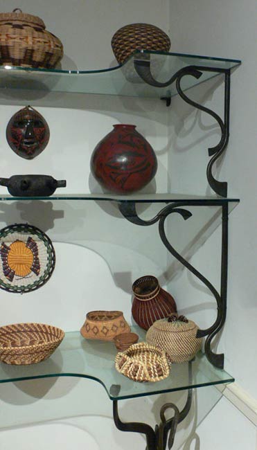 Freeform sculptural elements take on anthropomorphic gestures in this set of shelf supports for a ceramic collection.