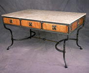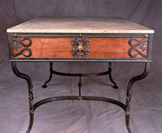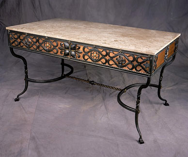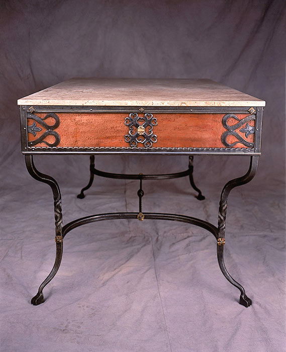 Intricate forged steel motifs overlay a skirt of beaten copper, while utilitarian concerns are met in the form of 3 sliding drawers made from heavily figured cherry wood. The rich combination of materials, texture and color make this a seminal piece.