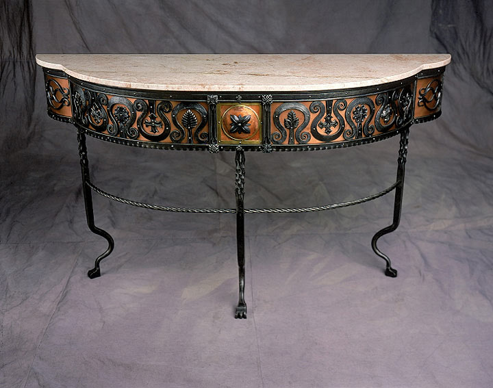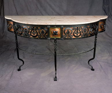 This console table was designed for placement in a hallway or foyer. It not only serves as a pedestal for ornamentation, but its visual presence and ornate detail work make for a singularly elegant statement.