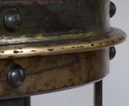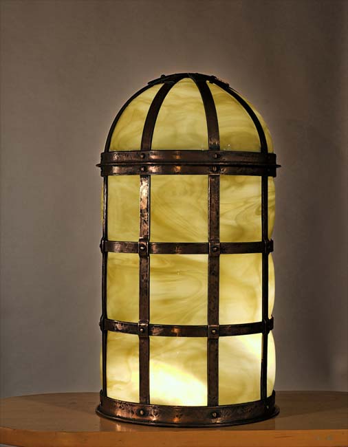 A sleeve of yellow glass is blown directly into the cage and billows out slightly through the openings. The riveted steel armature is complex and precise, with a working hinged door and removable base plate for interior access.