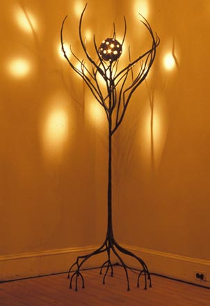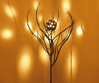 Inspired by the bare structural beauty of trees in winter, this sculptural floor lamp casts a dramatic inverse cast shadow effect. The central orb was made in two hemispherical halves with holes punched outward, tearing and stretching the metal at every porous opening, giving it an asteroid-like appearance.