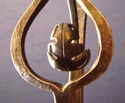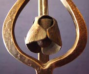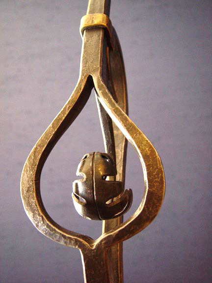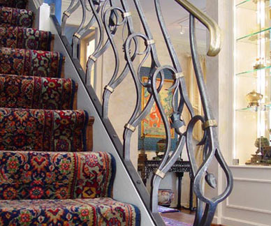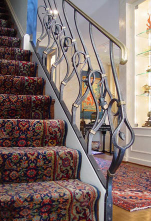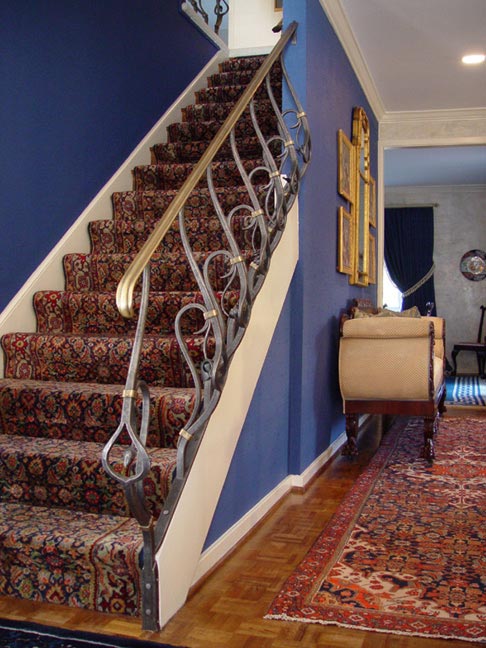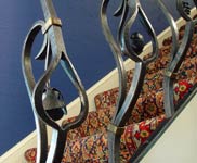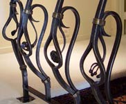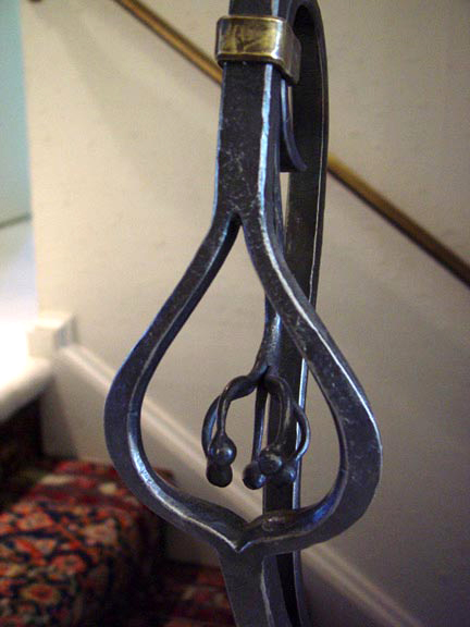 Here, repetition of form sets up a distinctly lyrical rhythm. Within the framework of the bellying pickets are individual elements that give the piece a sense of playfulness. The vertical pickets are “hot” split and forged out laterally, then formed over a jig. This creates the effect of a picture window in which the unique floral features exist.